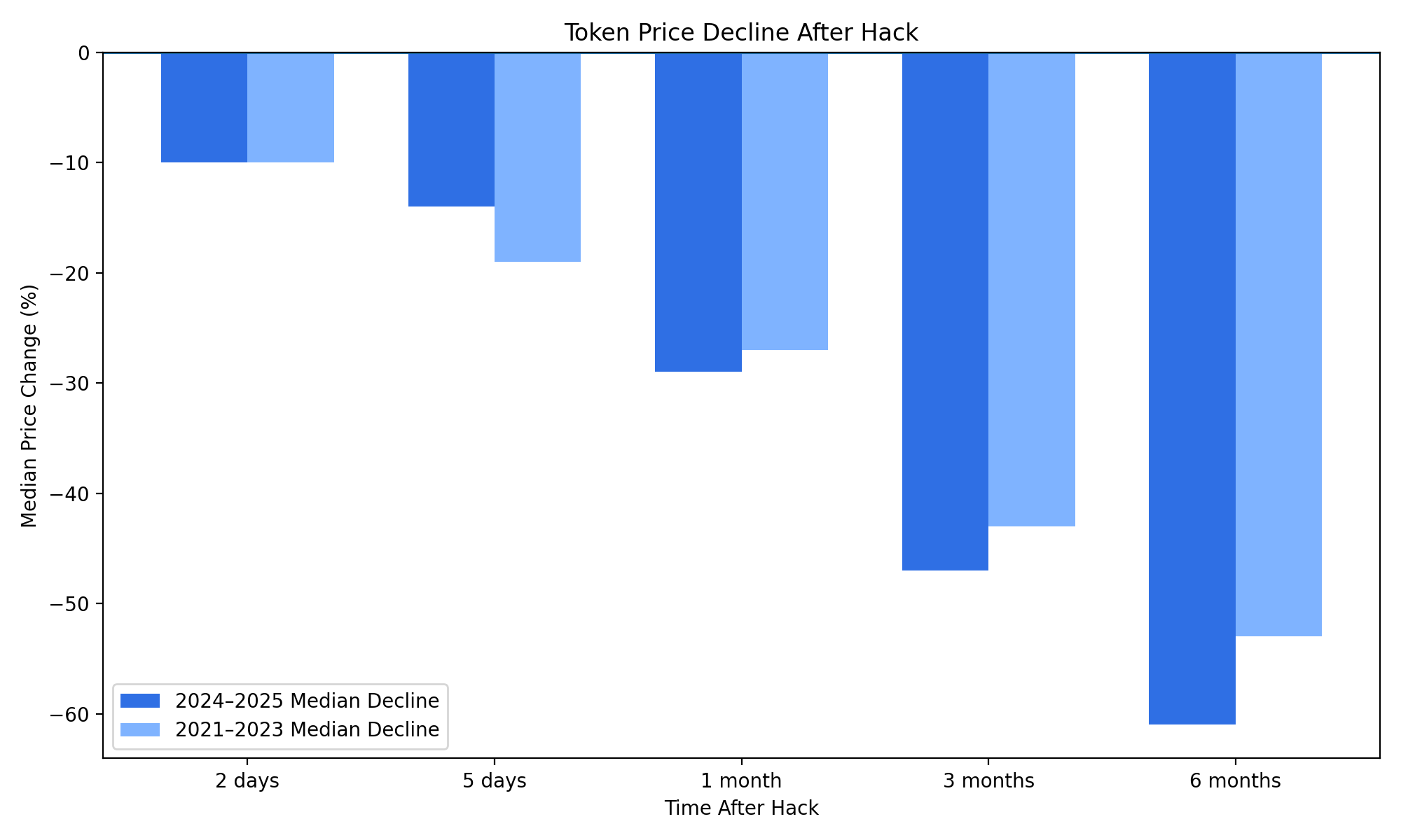 The bad news: the market has gotten harsher, not kinder. Hacked tokens now lose a median 61% of their value within six months, up from 53%. And 84% of hacked tokens never recover within that window. The average hack still costs $25M (11x the median) because a handful of catastrophic breaches drag everything up. The top five exploits in 2024–2025 accounted for 62% of all funds stolen. Bybit alone was 32% of the two-year total.