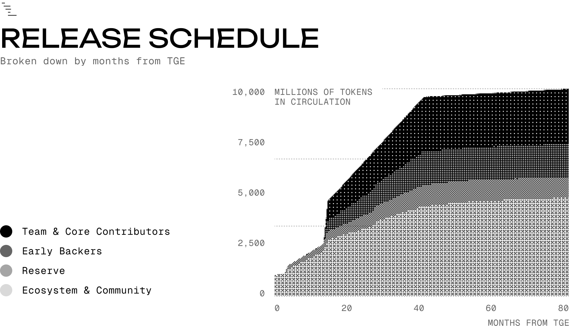Nearly half of the tokens support ecosystem growth and community rewards. This pool funds pre-listing sales, user incentives (e.g. bug bounty bonuses, staking rewards), partnerships, airdrops, marketing, and liquidity. The large allocation ensures the token directly drives adoption and engagement.